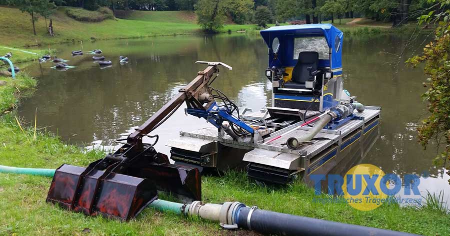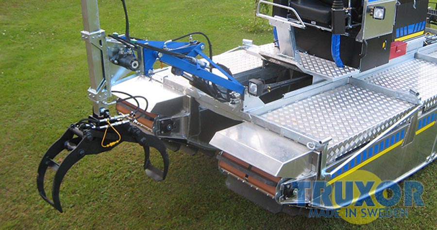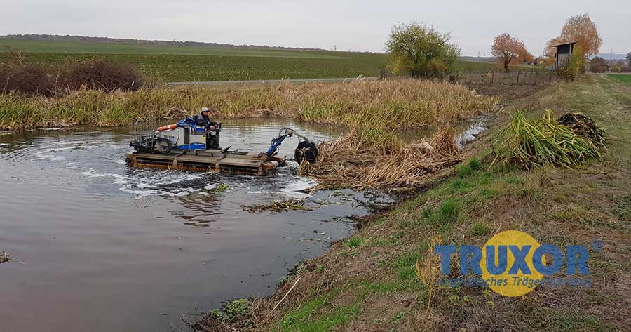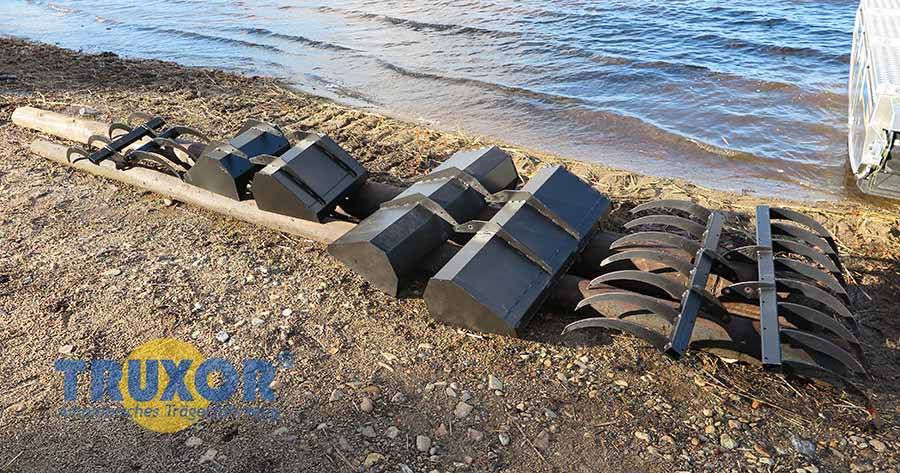 Bei Arbeiten in Ufernähe oder außerhalb des Wassers wird die mechanische Halterung für den Greifer und die Klappschaufel empfohlen. Die Arbeitstiefe beträgt dann ca. 0,9 m. Die mechanische Halterung hat ein geringeres Gewicht, die im Vergleich zu Geräten, die an der Teleskopverlängerung montiert werden und dadurch eine höhere Hubkraft hat.